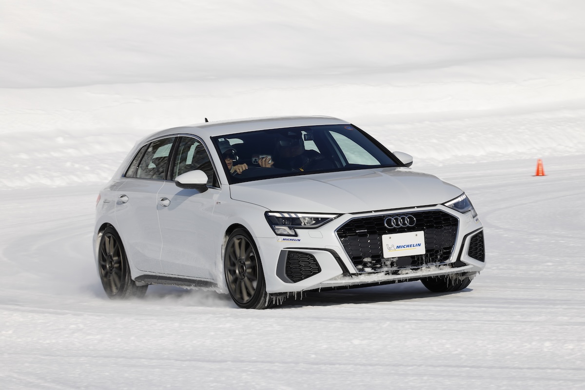 次に定常円旋回ではアウディA3スポーツバックに装着したテスト車両で、先代モデルのCC2もテストに加え、CC3、そしてスタッドレスの3タイプの違いをテストした。