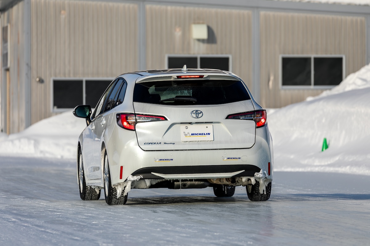 まずは30km/hからの氷盤路制動テスト。車両はフォクルクワーゲンゴルフとカローラツーリングで行ない、CC3とCCS3の違いをテストしたが、氷の路面は正直なところ「止まる気配がない」。どちらのタイヤもABS頼みでグリップ力は失われたままだ。もしABSが働かなければ直進状態は保てず、最も簡単にスピンをするだろう。これが30km/hの速度なので、路面凍結した場所は回避すべきだ。