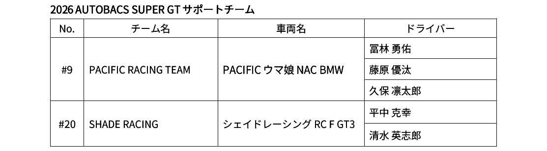 GT300クラスの#9(チーム名:PACIFIC RACING TEAM)と、#20シェイドレーシングRC F(チーム名:SHADE RACING)にタイヤを供給する。GT300クラスにおいてシリーズチャンピオンを獲得できるよう、ミシュランタイヤ装着車を全力でサポートする。